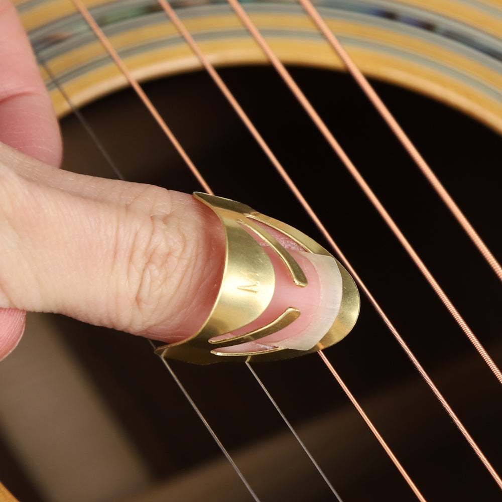 使用方法は、下の写真のように指にかぶせ、ピックの先端部分に爪を引っ掛けます。自分の爪は「ピックに引っ掛ける」程度で十分なので、長く伸ばす必はありません。より自然な装着感を得るために、自分の爪を手入れするのと同様、ピックを加工して下さい