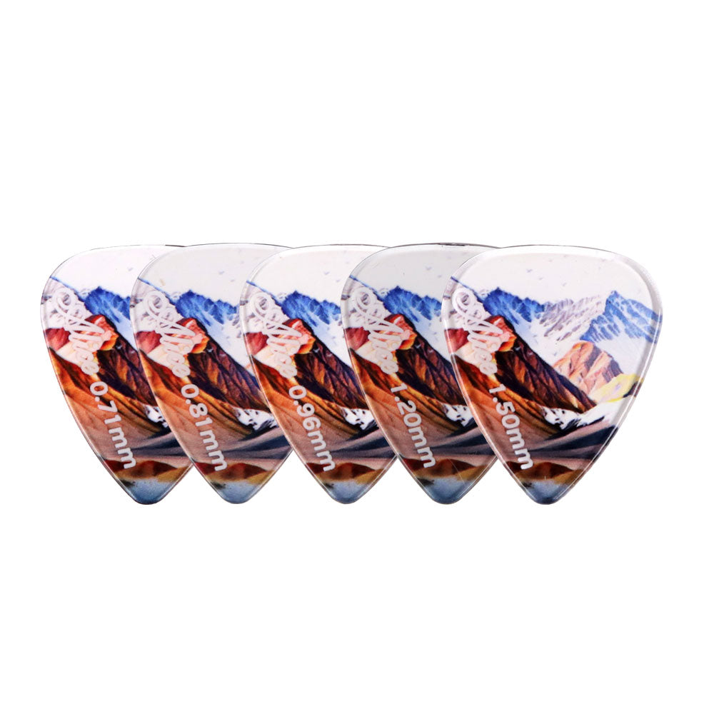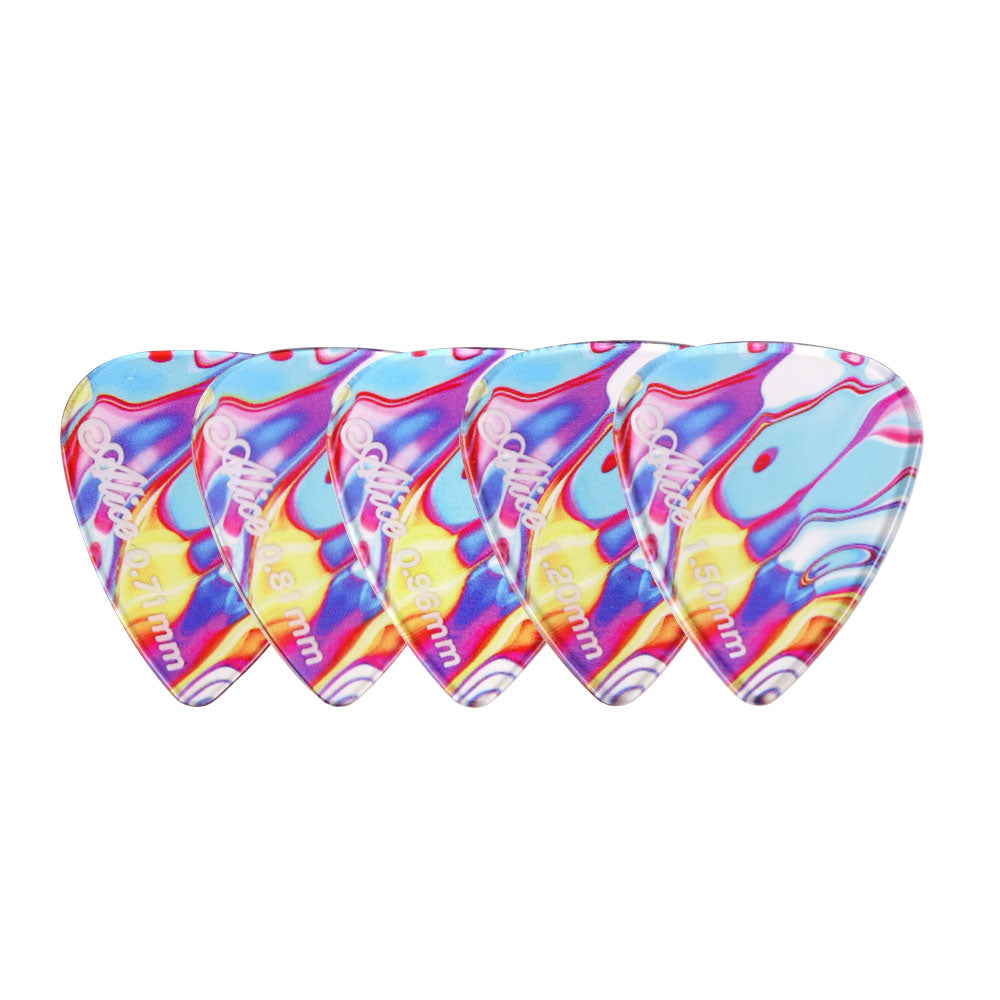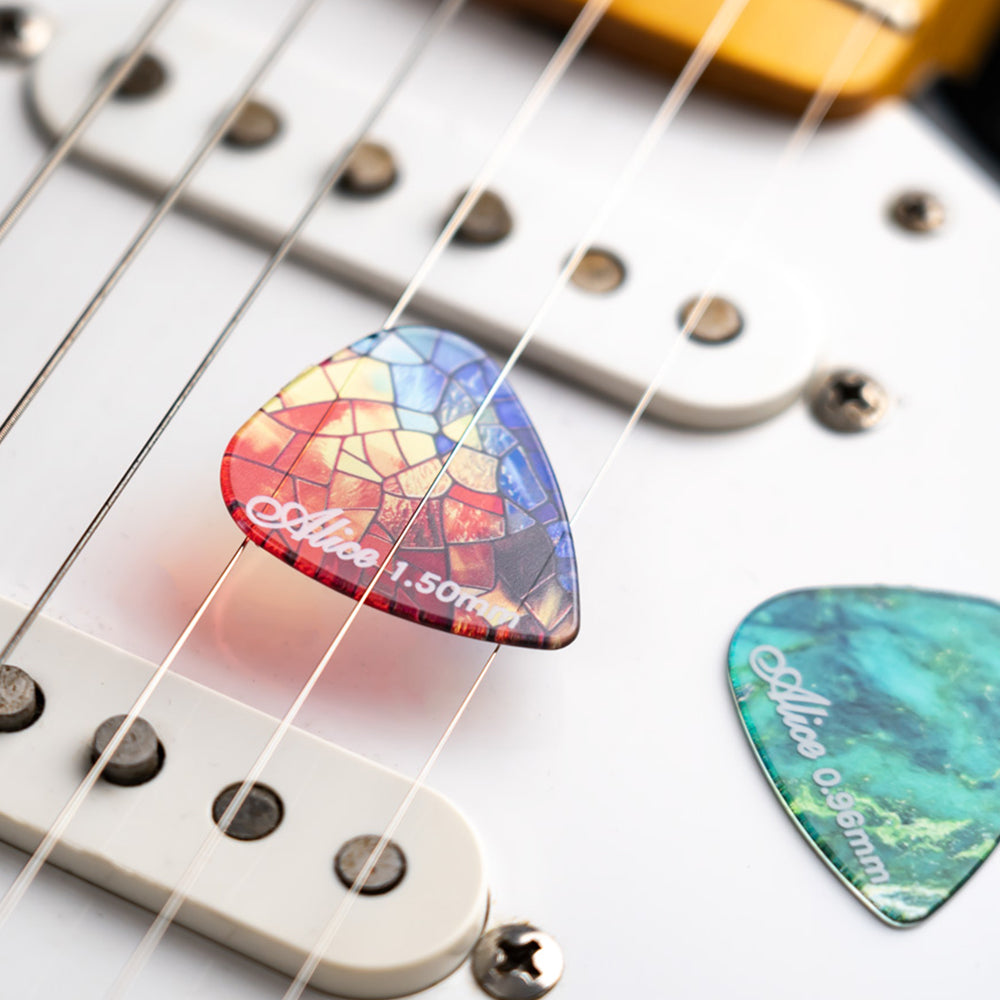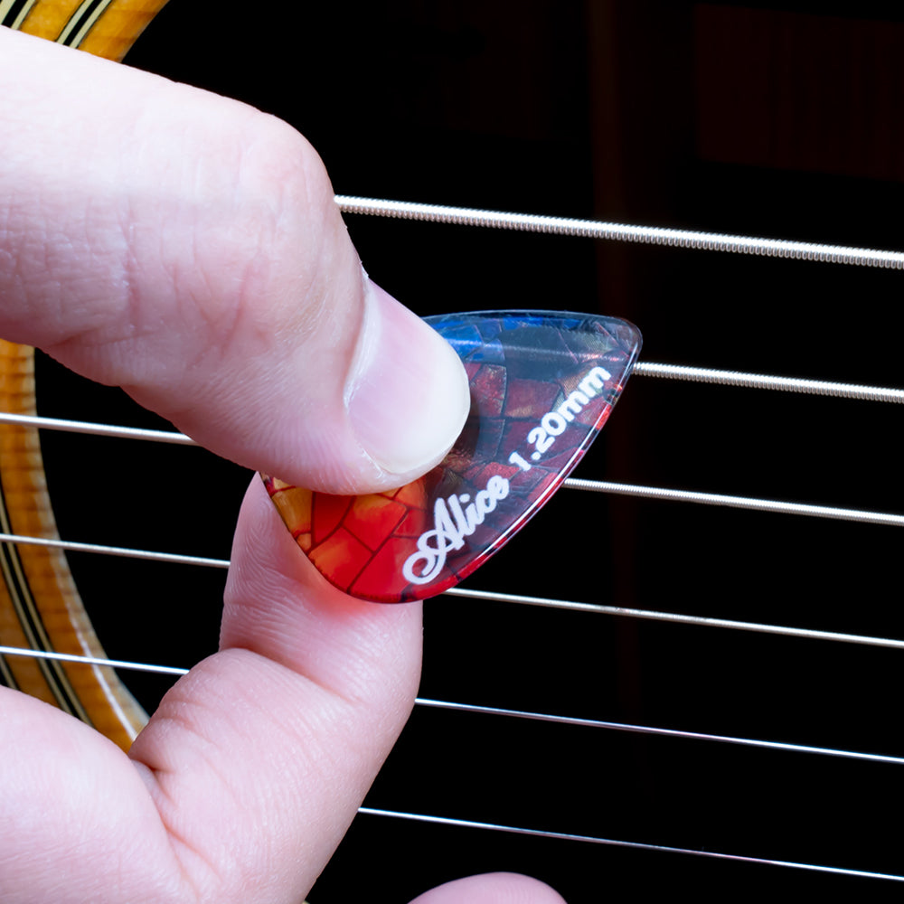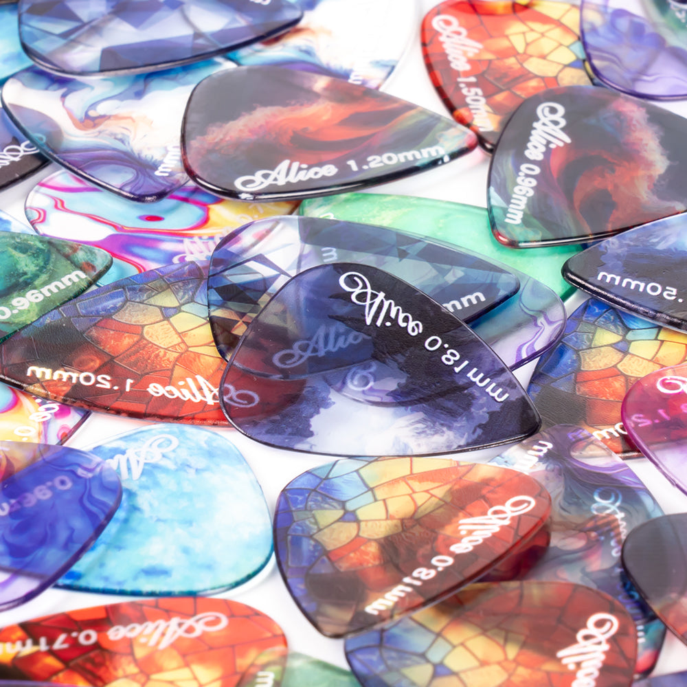 アリス幻夢シリーズのギターピックは、鮮やかな色彩のデザインが特徴で、手触りが快適で、ストロークが滑らかで、音色も豊かです。