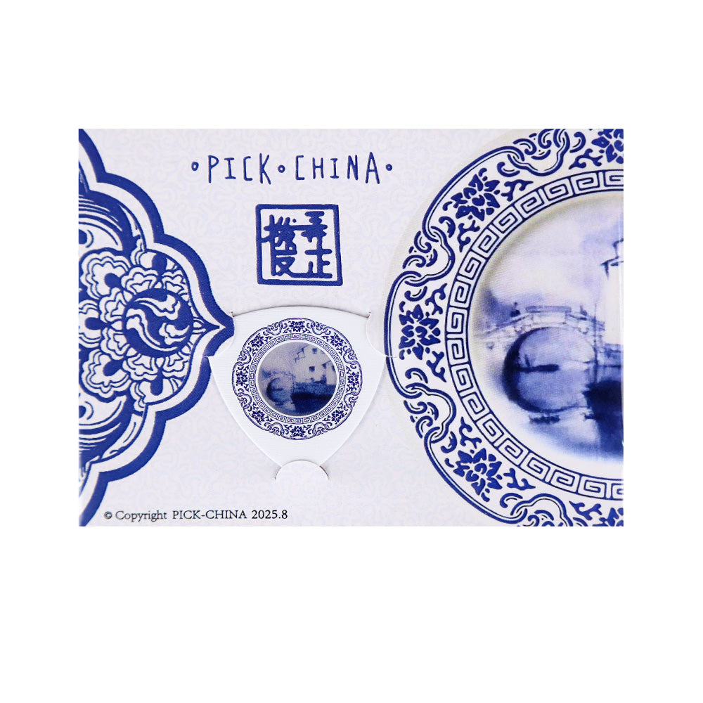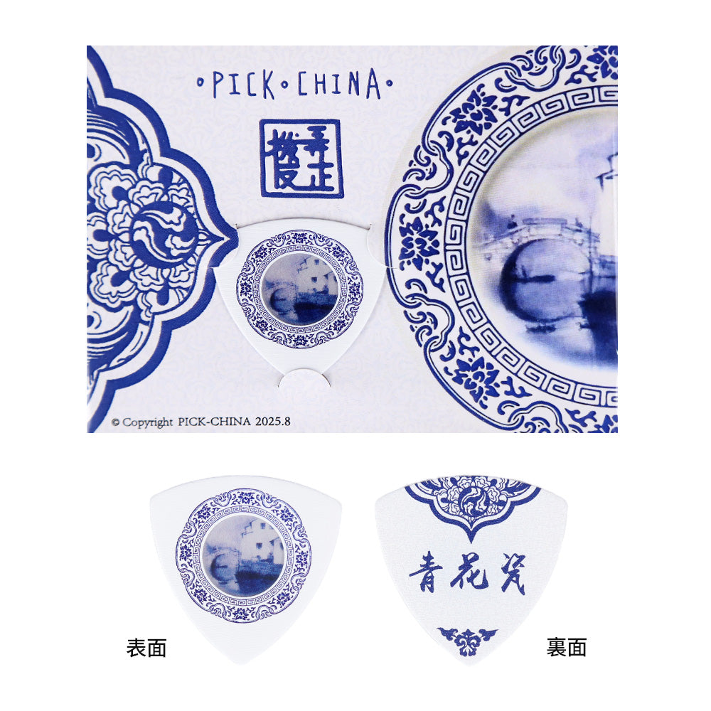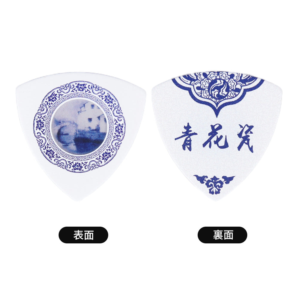 白地に中国青花瓷(せいかじ)の繊細な模様をあしらった、アートピックのような美しさ。1.0mmのトライアングル形状で、クラシックからアコースティックまで幅広く対応。