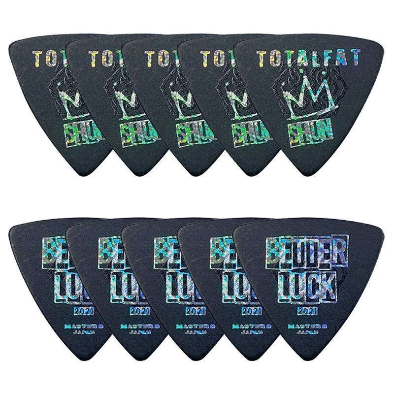 初のシグネチャーピックは、D-801シリーズをベースにコンパクトなJazz Typeのシェイプに1.5mmのボディをセレクト。小回りの効く小さなボディと指のタッチをダイレクトに伝える厚み、D-801歪み乗りを意識したアタック感の特徴となっている。煌びやかなゴールドでプリントされた彼のメインロゴと強力なサンドグリップが両面にプリントされている。